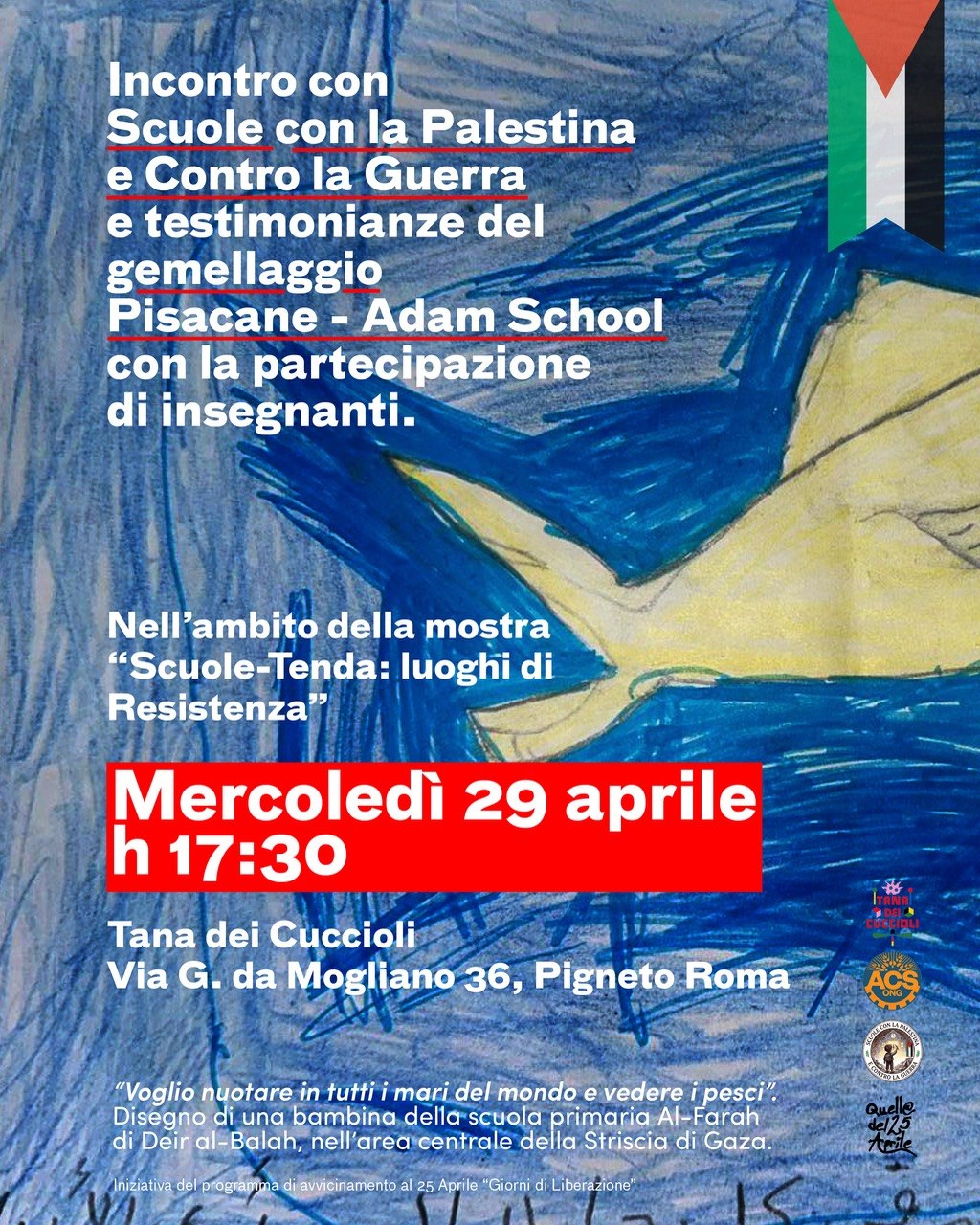 Nell’ambito della mostra “Scuole-Tenda: luoghi di Resistenza”, mercoledì 29 aprile dalle ore 17:30 incontreremo alla Tana dei Cuccioli il gruppo “Scuole con la Palestina e Contro la Guerra” e le insegnanti della scuola Pisacane per conoscere e approfondire il progetto di sostegno alle scuole-tenda, promosso da ACS Onlus – Associazione di Cooperazione e Solidarietà.