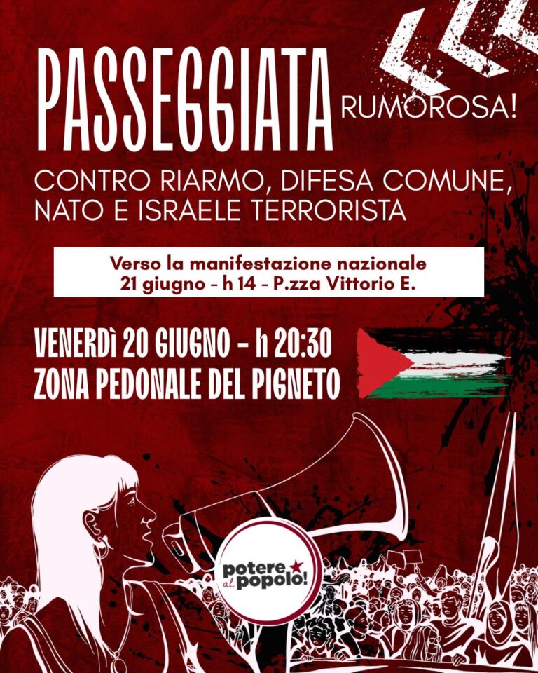 PASSEGGIATA RUMOROSA PER LE STRADE DEL PIGNETO CONTRO RIARMO, GUERRA, NATO E LO STATO TERRORISTA DI ISRAELE!VERSO LA MANIFESTAZIONE NAZIONALE DEL 21 GIUGNO A PIAZZA VITTORIO EMANUELEAd un giorno dalla manifestazione nazionale che ci sarà sabato 21 giugno vogliamo riempire le strade del Pigneto con una passeggiata rumorosa che faccia sentire le voci di chi non accetta quanto sta accadendo e vuole cambiare attivamente le cose.Il governo Meloni continua a soffiare sul fuoco appoggiando riarmo e genocidio, il centrosinistra si nasconde dietro una famigerata “difesa comune” che altro non è che ulteriore spesa militare a livello Europeo mentre sono nel vicolo cieco della denuncia delle brutalità in Palestina, senza volersi esprimere contro il sionismo e la violenza terrorista di Israele.Intanto gli 800miliardi promessi agli armamenti vengono tolti dagli investimenti per i servizi e le tutele di tutte e tutti noi, colpendo più duramente le fasce popolari.Venerdì 20 giugno alle ore 20:30 ci riprendiamo le strade e i quartieri della nostra città invitando tutte e tutti a raggiungerci per farci sentire!